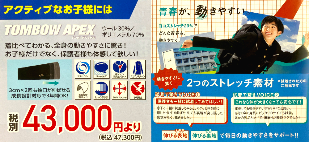 | 特徴 | 《ウール30%/ポリエステル70%》 ★驚異のヨコストレッチ20% ★背裏が観音仕様 ●画期的な快適えり元デュアル襟芯使用 ●細身でかっこいいスリムパターン ●成長に合わせて袖が伸ばせる ●撥水・静電防止・抗菌防臭加工 丸洗いOK! |